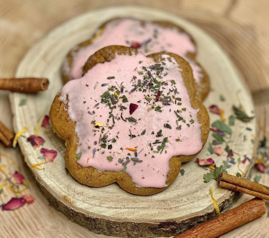 Piernik z lukrem różanym, ziołami i kwiatami róż ciasto orkiszowe z galgantem i bertramem.